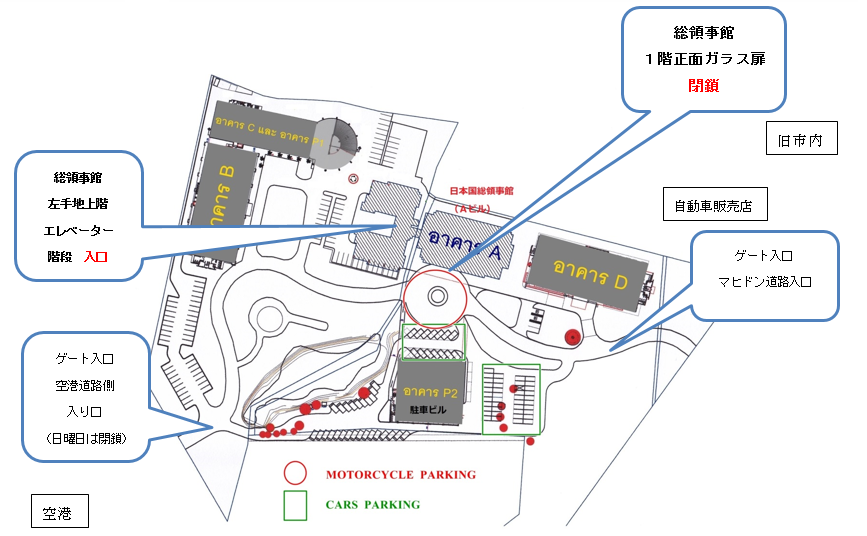 在チェンマイ日本国総領事館1階正面ガラス扉の閉鎖のお知らせ 令和元年7月18日 ビルメインテナンスの関係で、在チェンマイ日本国総領事館1階正面ガラス扉が下記の期間閉鎖となります。総領事館正面向かって左手の地上階(Grand Floor)よりエレベーター若しくは階段を御利用のうえ、ご来館願います。 1階正面ガラス扉閉鎖期間:7月18日(木)から 7月28日(日) 以上ですが、ご理解とご協力をお願いします。