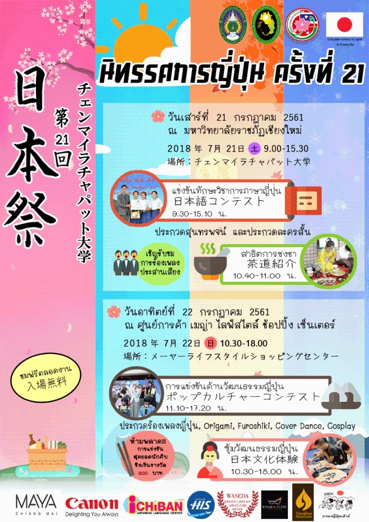 สถานกงสุลใหญ่ญี่ปุ่น ณ นครเชียงใหม่ร่วมกับมหาวิทยาลัยราชภัฏเชียงใหม่ จัดงานนิทรรศการญี่ปุ่นหรือ “นิฮงไซ” ครั้งที่ 21 ขึ้นในวันเสาร์ที่ 21 กรกฎาคม 2561 ณ มหาวิทยาลัยราชภัฏเชียงใหม่ และวันอาทิตย์ที่ 22 กรกฎาคม 2561 ณ ศูนย์การค้าเมญ่า ไลฟ์สไตล์ช้อปปิ้งเซ็นเตอร์ เชียงใหม่